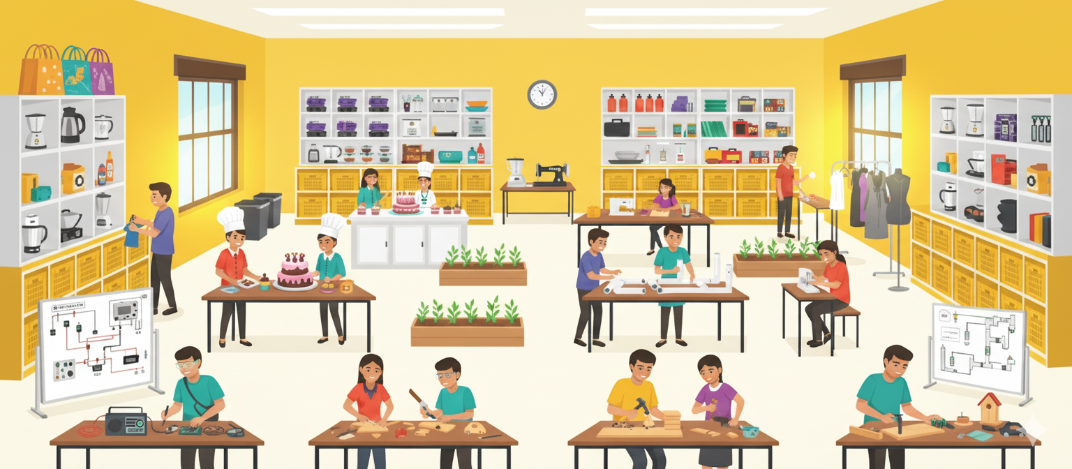 Designed to integrate vocational skills with the school curriculum, equipping students aged 10 to 14 with hands-on training in tools, science, and technology.